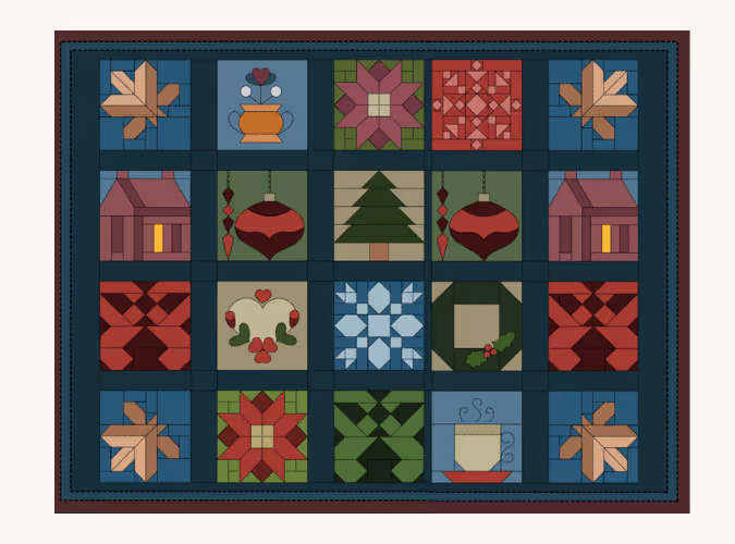 The design is inspired by a quilt made by Burns’ grandmother when she was a baby, which includes fabrics worn by her cousins. Her mother also quilts, bringing out these heirlooms during winter. These personal connections inspired Burns to create a traditional quilt-inspired design that celebrates family, friends, and the beauty of connection.